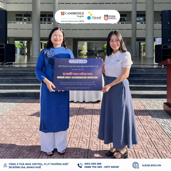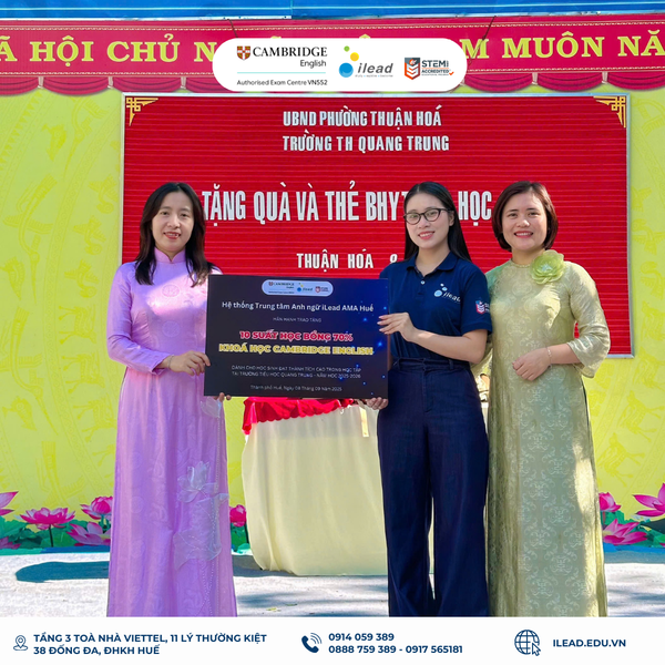 Với lộ trình học Cambridge English và phương pháp STREAM English độc quyền, iLEAD AMA Huế luôn nỗ lực mang đến môi trường học tập hiện đại, truyền cảm hứng và bám sát chuẩn quốc tế. Hoạt động trao học bổng lần này tiếp tục khẳng định cam kết của iLEAD trong việc lan tỏa giá trị giáo dục bền vững, đồng hành cùng thế hệ trẻ Huế trên hành trình hội nhập.